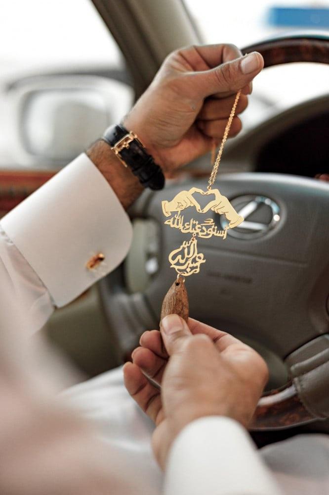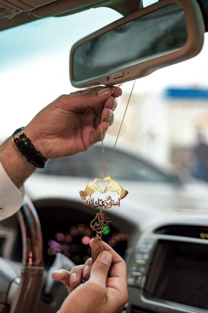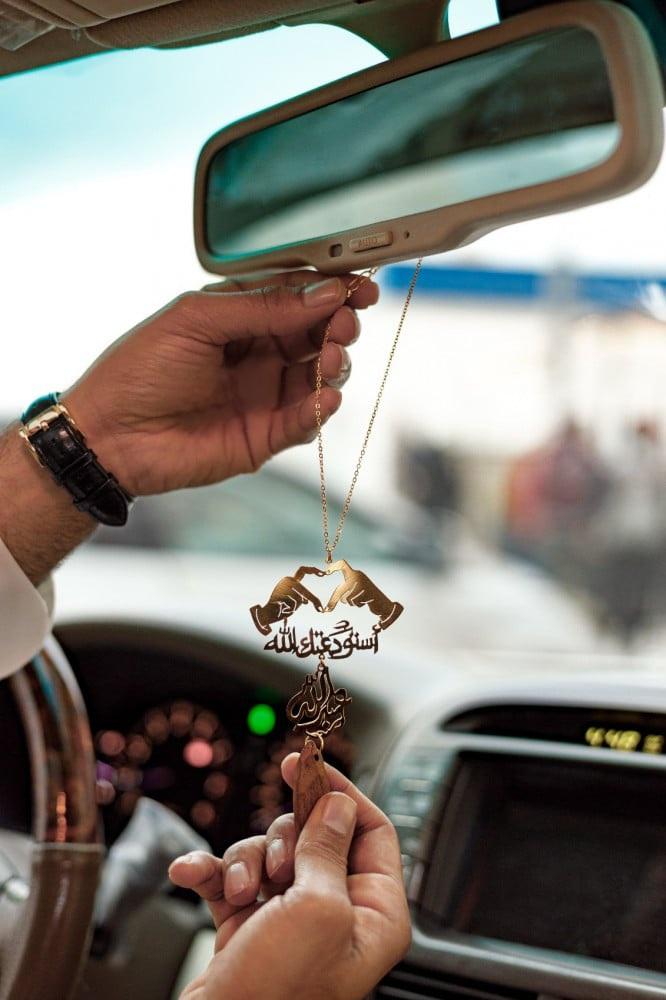 تعليقة سيارة عود بالاسم مع شكل قلب بيدين متوفر بطلاء ذهبي أو فضي أصلي وعبارة استودعتك الله بتصميم فني. أجمل تعليقات سيارة وهدايا رجالية