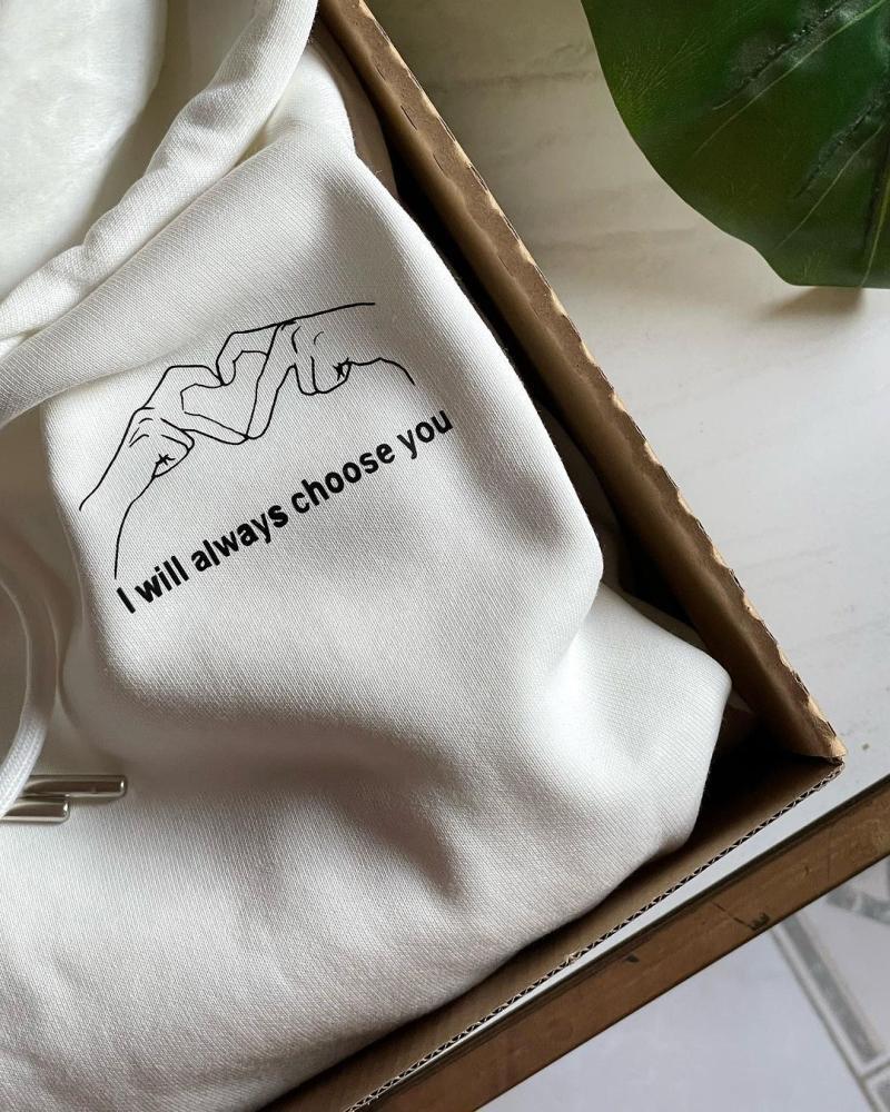 خلّك دافي وأنيق مع هودي “قلبي مع قلبك ولو ديارك بعيده” – هدية مثالية تعكس الحب والاهتمام بتصميم مخصص يضم رسالة دافئة لتبقى دائماً بقرب من تحب، حتى لو كانت المسافات بعيدة. مصنوع من خامات ناعمة وفاخرة، مع تصميم الأيدي المتشابكة وعبارة “I will always choose you”، ليجمع بين الراحة والأناقة في قطعة واحدة.