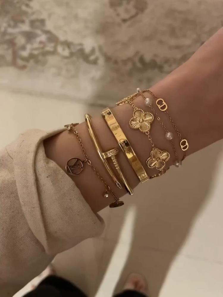 تألقي بإطلالة فاخرة مع مجموعة الأساور الذهبية المميزة التي تجمع بين الأناقة والعصرية تحتوي المجموعة على تصميمات متنوعة تشمل سوارا بتفاصيل زهرة البرسيم المصنوع من عرق اللؤلؤ، وسوارا بسلسلة ذهبية رفيعة مع عقدة أنيقة، بالإضافة إلى سوار بتصميم معدني عصري مرصع بلمسات براقة. هذه المجموعة مثالية لإبراز أنوثتك وتنسيقها مع إطلالاتك اليومية أو المسائية، كما تعد خيارا رائعا كهدية فاخرة.