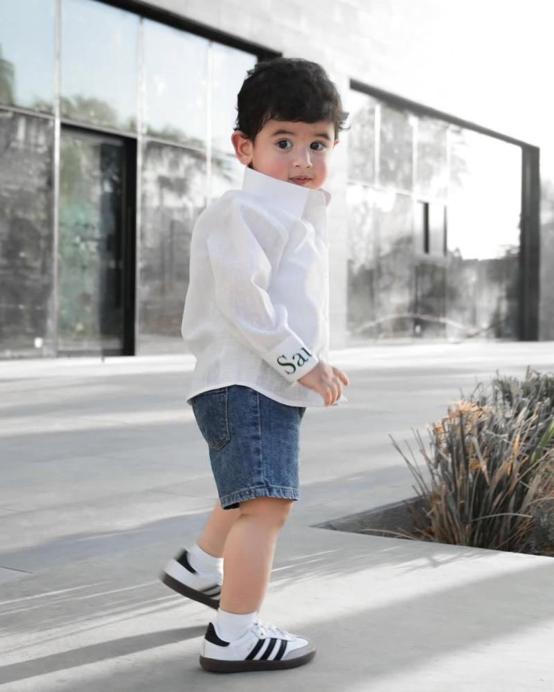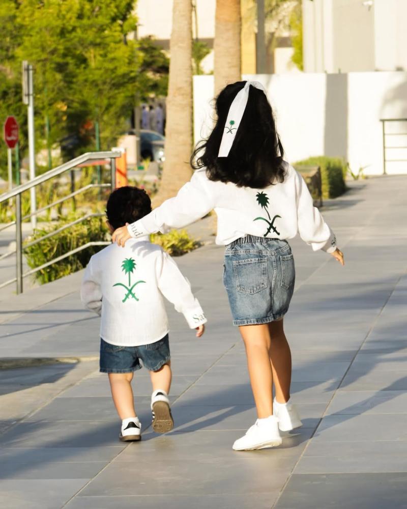 قميص رسمي قماش شبه واقف بلون أبيض مع تطريز سيفين ونخلة كبير بالخلف حدود ۲۰ سم + صغير من